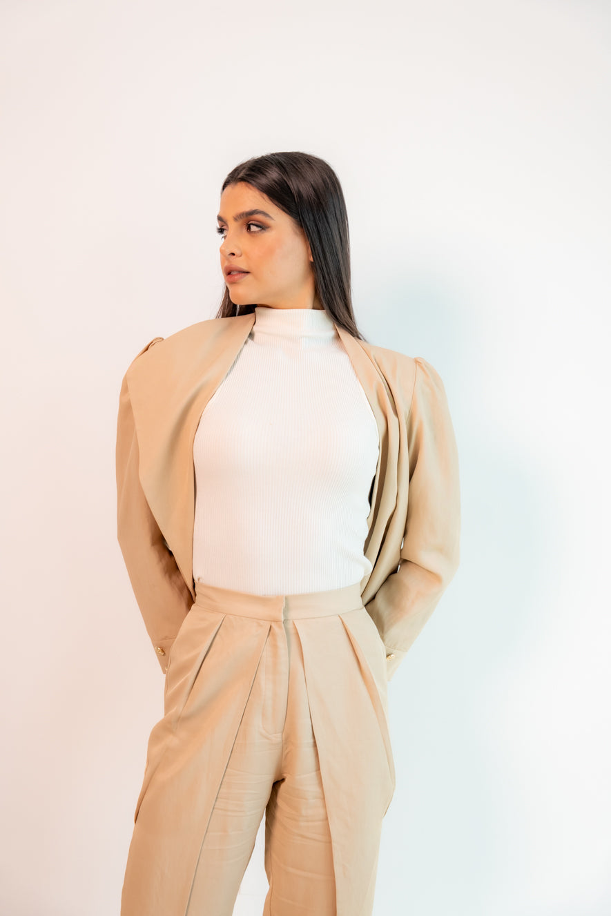 ارتديه مع السترة البيج المتناسقة لإطلالة أنيقة، أو مع بلوزة ناعمة لإطلالة يومية راقية. ولإطلالة عصرية أنيقة، نسّقيه مع توب بسيط من الصوف أو قميص أبيض، وأكملي الإطلالة بإكسسوارات بسيطة وحذاء بكعب عالٍ.